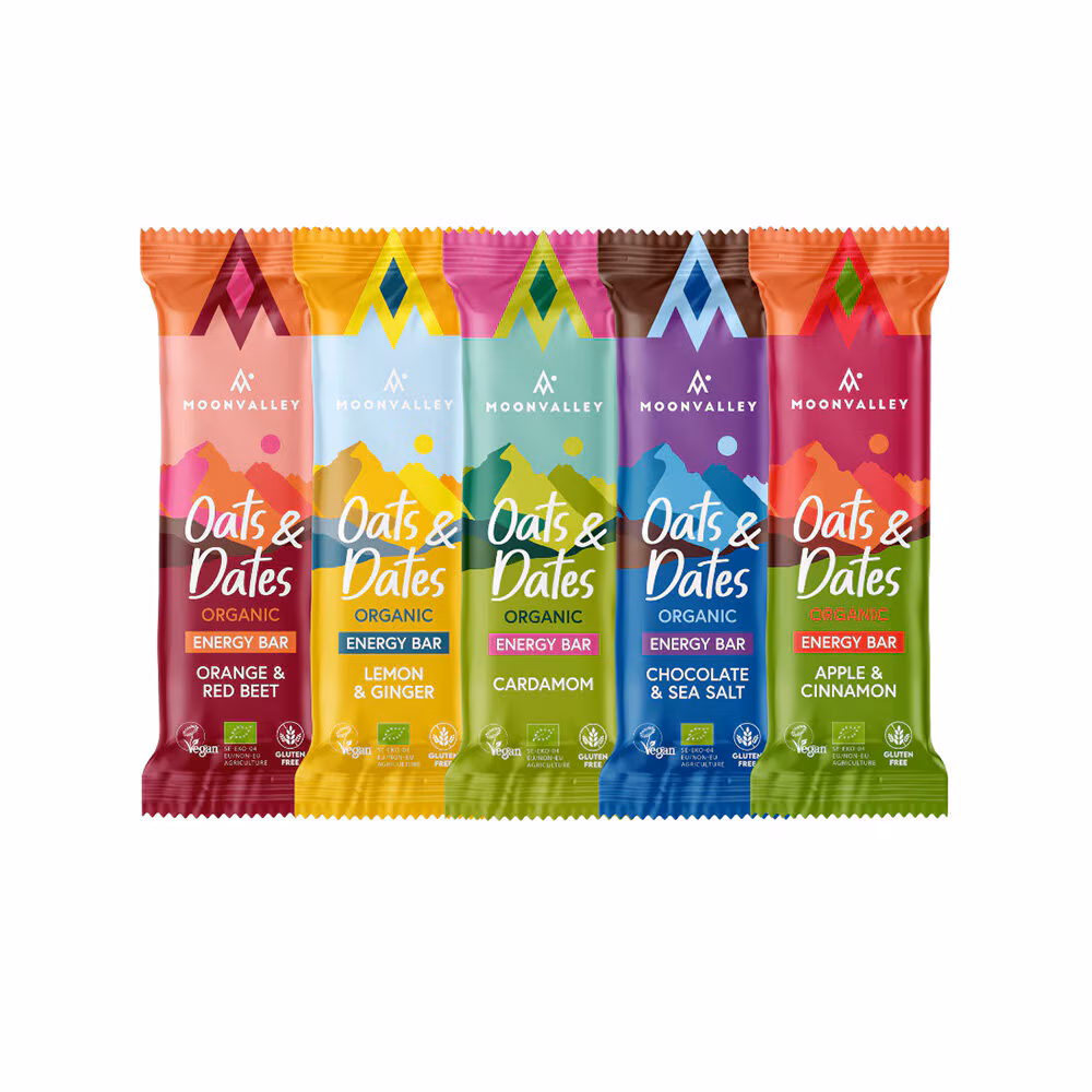 Bars Oats & Dates från Moonvalley – fem ekologiska och veganska energibars med rena, naturliga ingredienser. Smakerna citron & ingefära, rödbeta & apelsin, choklad & havssalt, kardemumma samt äpple & kanel bjuder på en härlig variation – från friskt och fruktigt till djupt chokladigt.